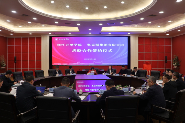10月24日下午,浙江万里学院与奥克斯集团有限公司战略合作签约仪式在行政楼112会议室举行。浙江万里学院校长林志华与奥克斯集团执行总裁李健出席,双方领导班子成员、相关部门负责人共同见证校企合作关键时刻。签约仪式由浙江万里学院副校长马建荣主持。